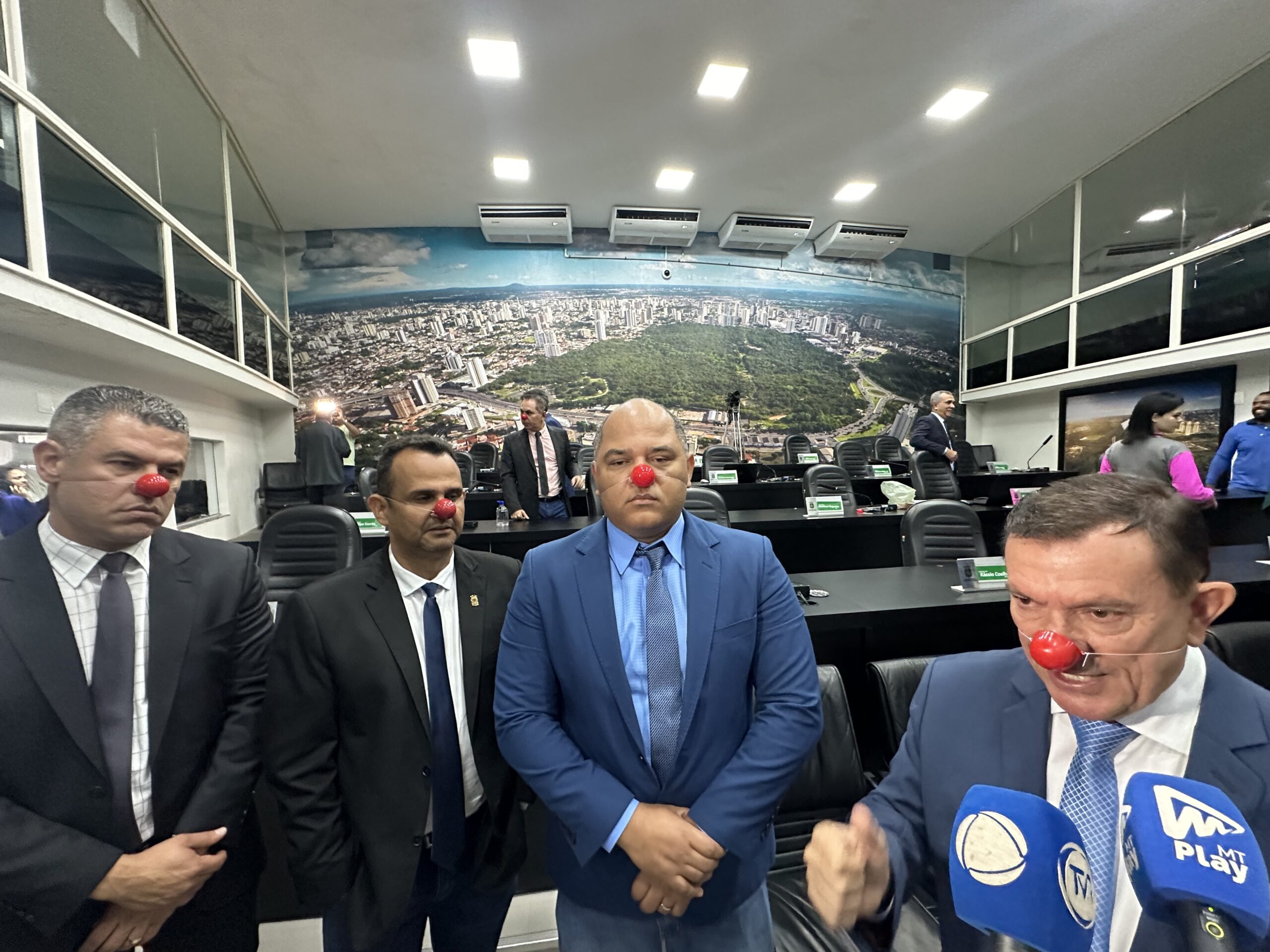 Na sessão ordinária desta quinta-feira (16), alguns vereadores da Câmara Municipal de Cuiabá protagonizaram um espetáculo digno de circo. Com nariz de palhaço, os parlamentares expressaram seu descontentamento com a decisão da justiça estadual de suspender a Comissão Processante contra o prefeito Emanuel Pinheiro (MDB). O deputado federal Abílio Brunini (PL), ex-vereador pela Capital, que estava mais uma vez presente acompanhando a sessão no Parlamento municipal, não aliviou a ação dos parlamentares, achou incorreta e declarou que foi uma ação que irá fazer os vereadores virarem ‘memes’ e alvos de piadas no meio político.