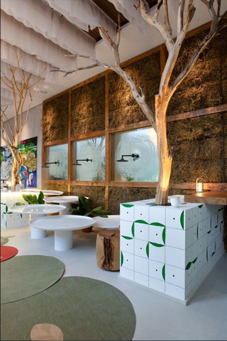 O tema central gira em torno das águas do Pantanal, uma parte essencial do ecossistema mato-grossense. O arquiteto Ivã Guimarães nos convida a refletir sobre a importância da água, da natureza e da preservação do Pantanal assim que cruzamos a entrada de seu ambiente. As paredes revestidas com feno não são meramente uma decoração, elas representam a busca contínua pela regeneração da pastagem nativa, essencial para a preservação das florestas. A água, que flui das florestas e do bioma pantaneiro, é um elemento central, e reforça a mensagem de cuidado com esse recurso precioso, evidenciada em todos os detalhes.
