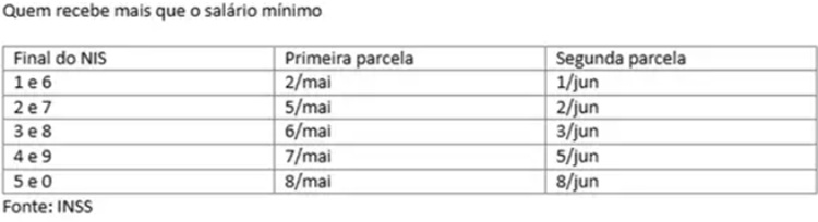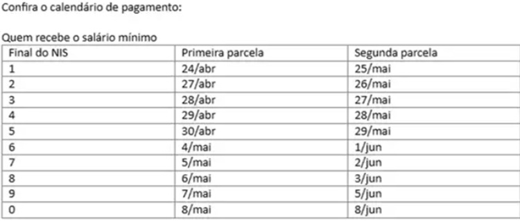 O benefício extra será pago em duas parcelas. A primeira será paga nesta sexta até 8 de maio. A segunda vai de 25 de maio a 8 de junho. As datas são definidas com base no dígito final do Número de Inscrição Social (NIS) e com base na renda do beneficiário. Quem ganha apenas o salário mínimo começa a receber antes de quem recebe mais que o mínimo.
