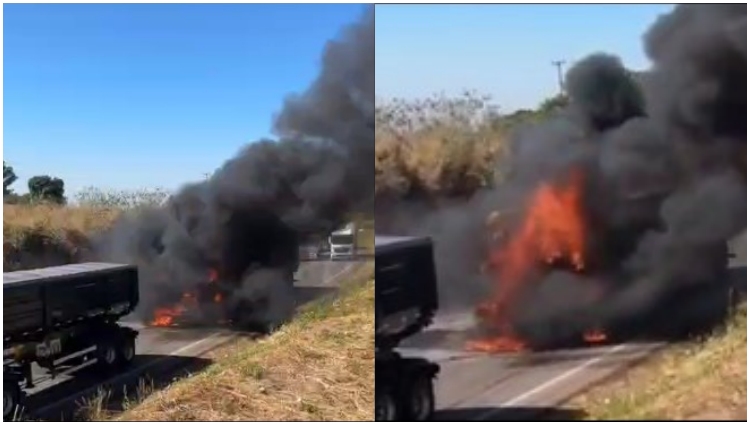Uma carreta que transportava enxofre pegou fogo na tarde desta quarta-feira (24) no km 279 da BR-364, em Jaciara. O fogo começou após uma colisão traseira entre duas carretas.