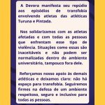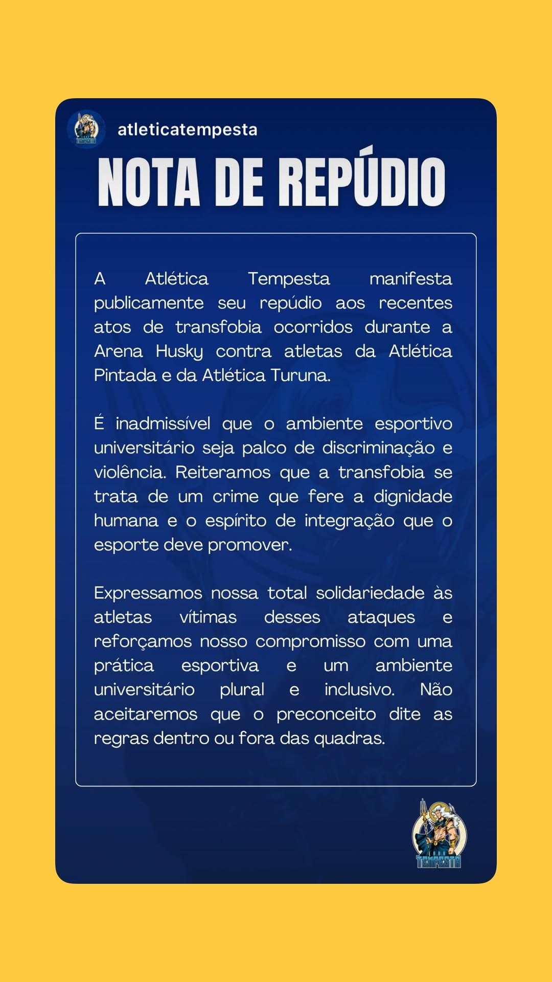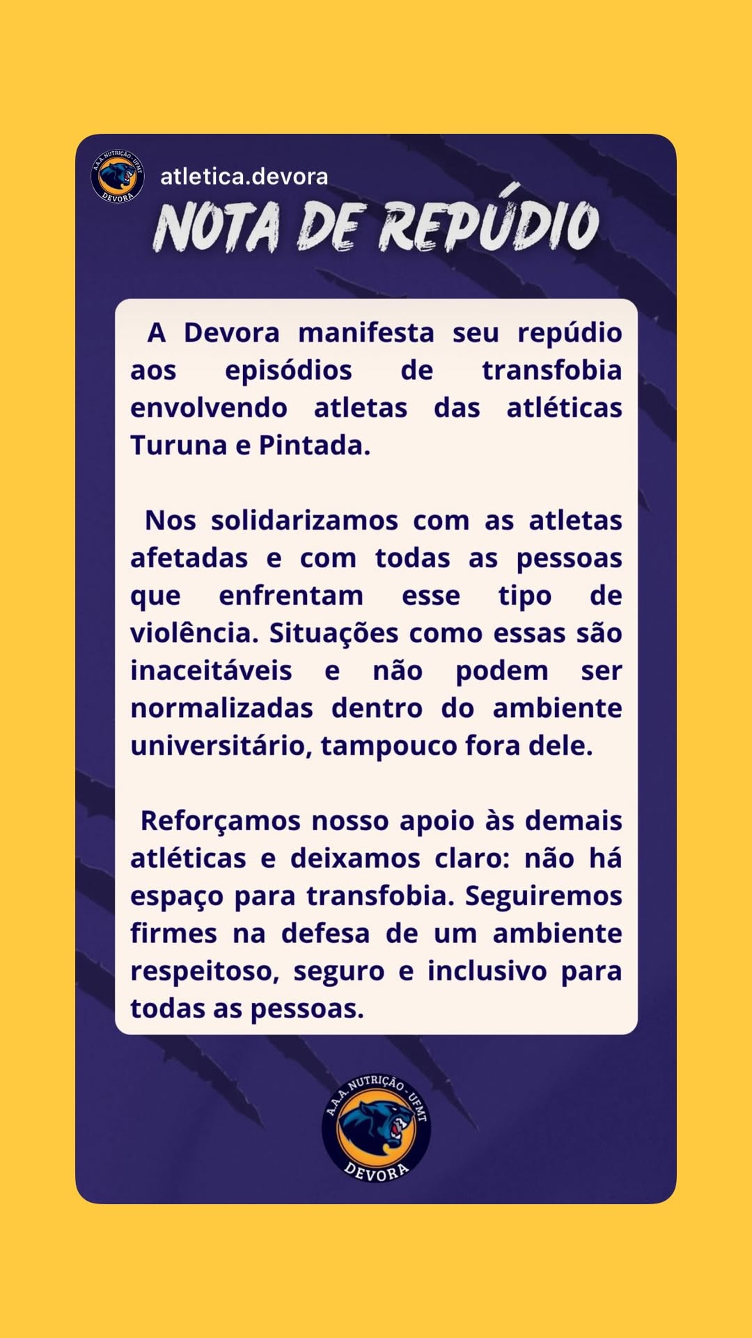 A Atlética Tempesta destacou que atitudes desse tipo ferem a dignidade humana e comprometem o ambiente esportivo universitário. Já a Atlética Arcaica afirmou que os atos são incompatíveis com os princípios do esporte e manifestou solidariedade às atletas envolvidas. No mesmo sentido, a Atlética Devora reiterou apoio às vítimas e defendeu um ambiente seguro, inclusivo e respeitoso.