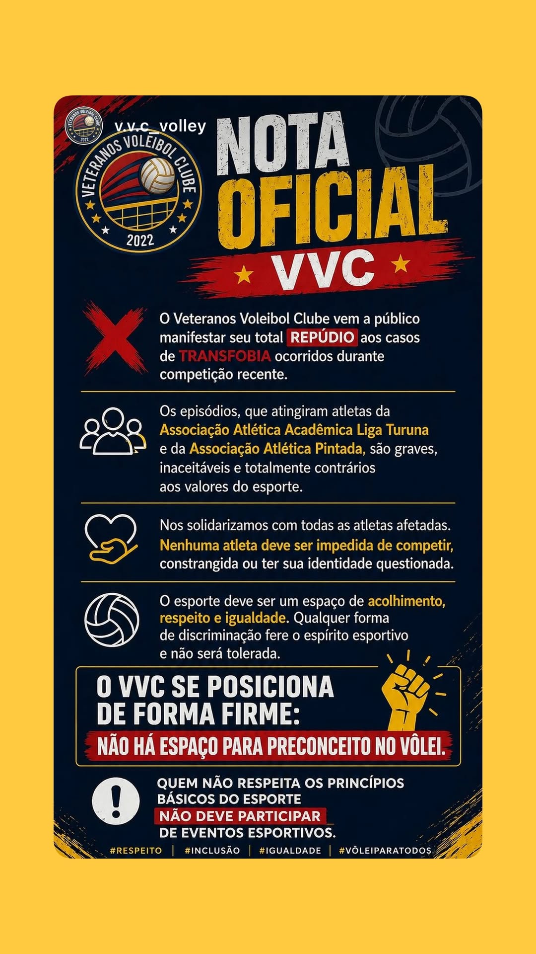 Após a repercussão, diversas atléticas e coletivos esportivos divulgaram notas públicas de repúdio. O Veteranos Voleibol Clube classificou o ocorrido como grave e reforçou que não há espaço para discriminação no esporte.