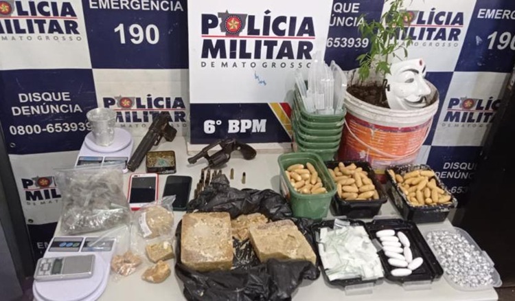 Policiais militares prenderam em flagrante um jovem faccionado de 20 anos, suspeito de tráfico ilícito de drogas e porte ilegal de arma, nesta quarta-feira (13.8), em Cáceres. Com o suspeito, a PM apreendeu mais de 630 porções de entorpecentes, tabletes de pasta base, um revólver e um simulacro de arma e munições.