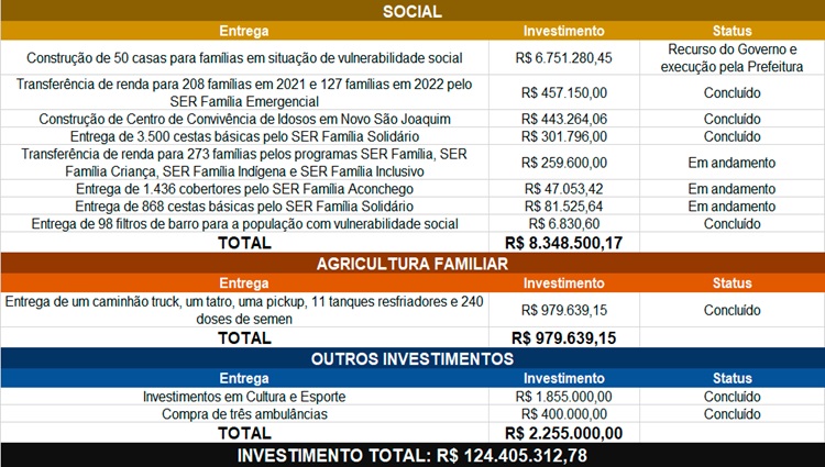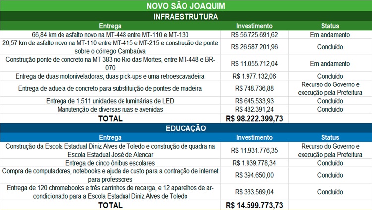 As principais ações do Estado em Novo São Joaquim são na área de Infraestrutura, com mais de R$ 98 milhões. Deste total, R$ 26,5 milhões foram destinados para o asfaltamento de 26,5 km e para a construção de uma ponte na MT-110, além de R$ 645 mil para a entrega de 1,5 mil luminárias de LED.