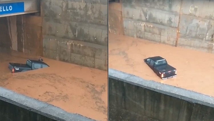 Após alguns segundos, o veículo é tomado pela água e apaga, deixando o condutor ilhado. A pessoa que filma grita para que o homem suba no teto da caminhonete, para que não seja levado também para debaixo d’água.