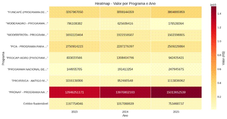 Mapa de calor representando a intensidade do crédito por programa (2023-2025)
