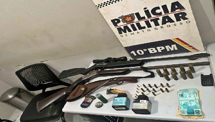 Equipes da Patrulha Rural do 10º Batalhão prenderam um homem, de 25 anos, por porte ilegal de arma de fogo, na noite desta quarta-feira (02.4), na zona rural de Cuiabá. Com o suspeito, a PM apreendeu três armas de fogo, munições e pólvora.