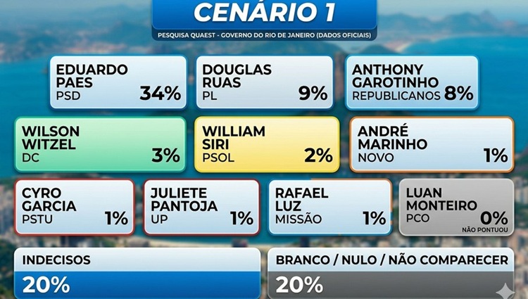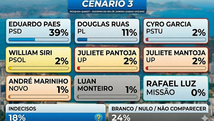 A nova pesquisa do instituto Quaest, divulgada nesta segunda-feira (27), mostra que o ex-prefeito Eduardo Paes (PSD) aparece na liderança da disputa pelo governo do Rio de Janeiro em todos os cenários testados, com até 40% das intenções de voto. O principal adversário é o deputado estadual Douglas Ruas (PL), atual presidente da Assembleia Legislativa do Estado do Rio de Janeiro, representado por até 11% no levantamento que simula a disputa estadual das Eleições 2026.