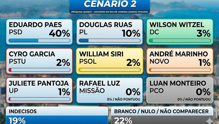 Já no terceiro cenário, que desconsidera a candidatura de Wilson Witzel (DC), ex-governador cassado após o Impeachment em 2021, Eduardo Paes (PSD) tem 39%, enquanto seus adversários: