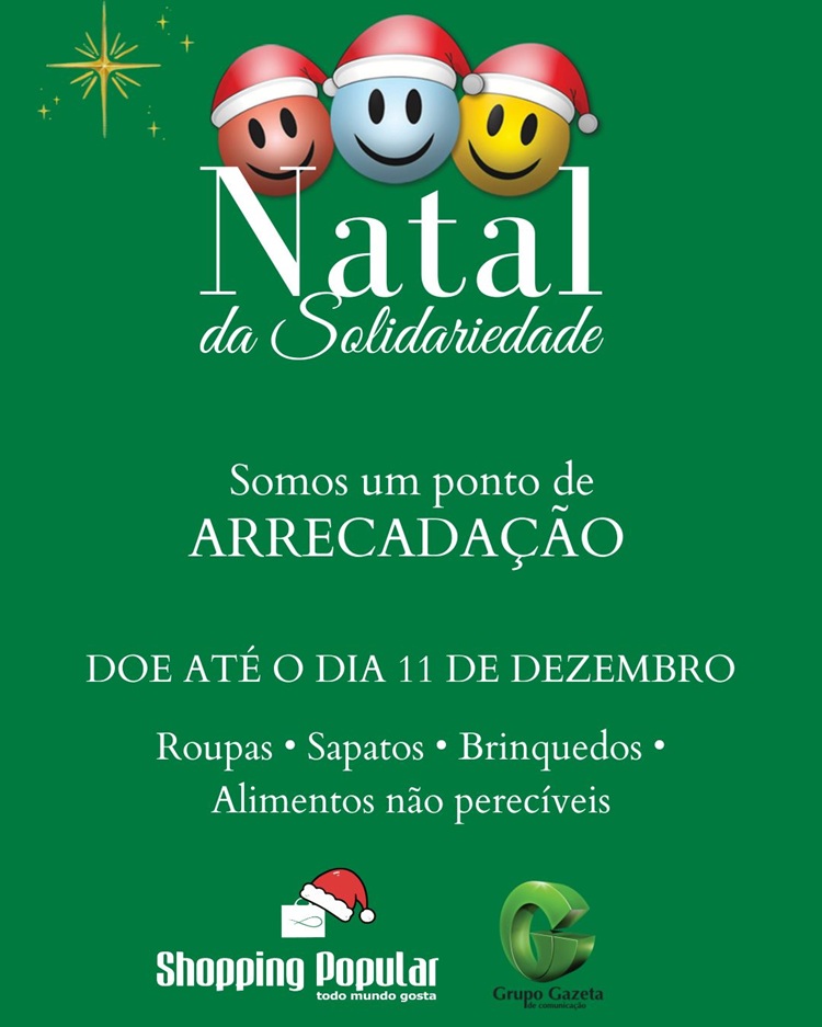 O Shopping Popular e o Grupo Gazeta de Comunicação reafirmam, neste ano, a parceria tradicional do Natal da Solidariedade. A ação conjunta já acontece há mais de 28 anos e se tornou um sucesso graças ao grande fluxo de pessoas que circulam diariamente pelo Centro Comercial Popular.