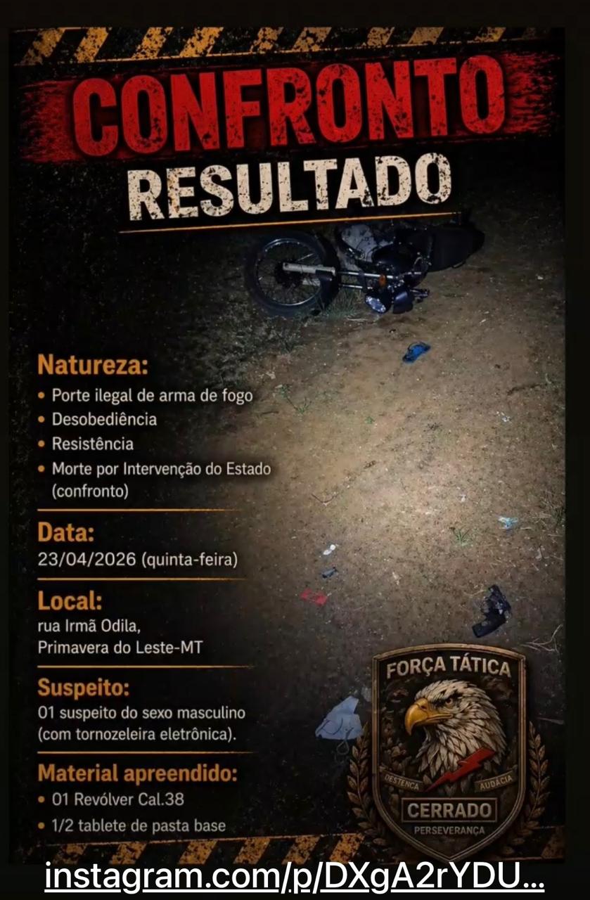 Um suspeito de 22 anos, identificado como Pablo Henrique, morreu na noite desta quinta-feira (23), após um confronto armado entre a Polícia Militar, em Primavera do Leste. O episódio ocorreu por volta das 21h15, no bairro Eldorado, após agentes da Força Tática receberem denúncias sobre um suposto integrante de uma facção criminosa que estaria comercializando entorpecentes na Rua Irmã Odila.