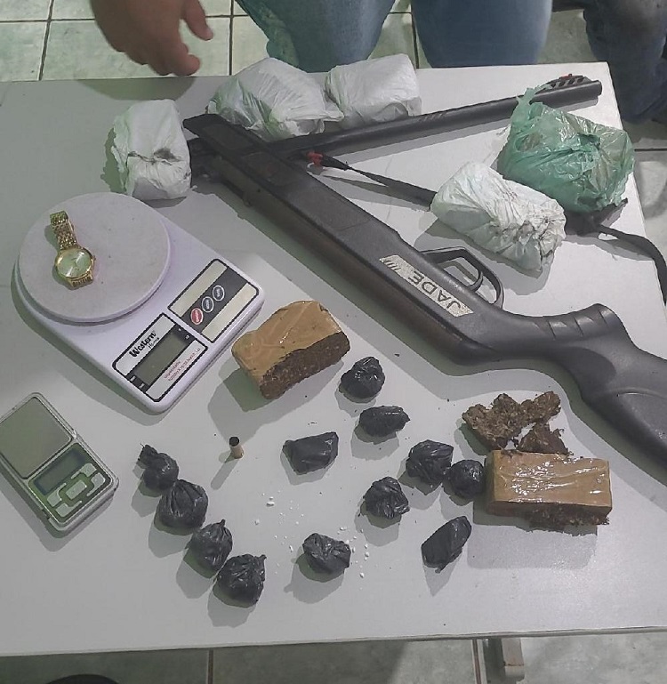 Ao ser perguntado sobre as drogas, o suspeito respondeu que estavam em seu quarto. Foram apreendidas porções de pasta base de cocaína, cocaína e maconha, dinheiro, munições de calibre 22 e 38, balança de precisão, uma carabina de pressão adulterada para calibre 22 e um revólver de calibre 38.