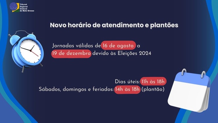 O Tribunal Regional Eleitoral de Mato Grosso (TRE-MT) adotará um novo horário de atendimento, no período de 16 de agosto a 19 de dezembro deste ano. Nos dias úteis, o atendimento ao público externo será das 11h às 18h, e aos sábados, domingos e feriados, das 14h às 18h, em regime de plantão. Além disso, em 15 de agosto, data limite para o registro de candidaturas, o horário de atendimento ao público será das 9h às 19h.