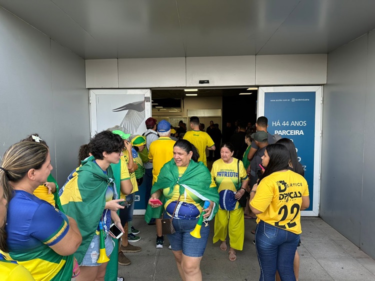 Com a programação de chagada marcada para acontecer no aeroporto Marechal Rondon, apoiadores vestidos com as cores de verde e amarelo tomam conta de todo o espaço no saguão, onde é possível ver famílias cantando o hino nacional e agitando bandeiras do Brasil.